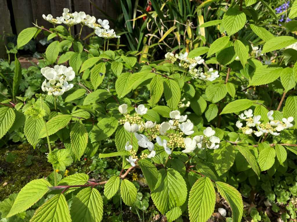 Viburnum plicatum f. tomentosum Mariesii, in its third year in the garden so still quite low growing but with a good number of flowers on show this year.