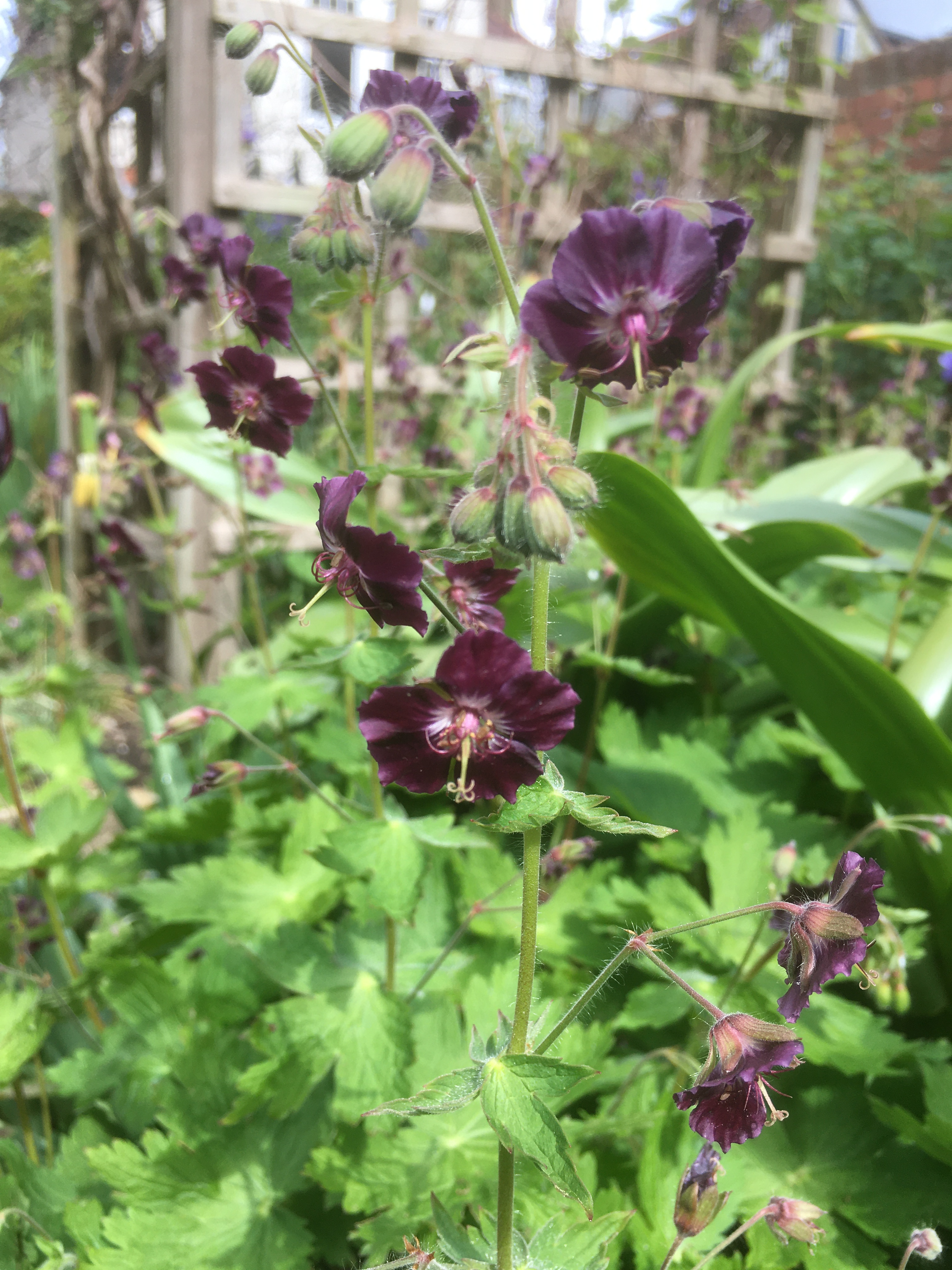 A house move some years ago delivered a challenging new space. First steps were to reclaim the garden from weeds: ground elder, enchanter’s nightshade, herb robert and rose bay willow herb to name a few. Then the planting could begin. Annuals were an important feature of the first summer, easy to grow and inexpensive. Roses were added in the first year and the plants that came from the old garden: geraniums, delphiniums, agapanthus for the terrace and reliable self-seeders such as verbena bonariensis and alchemilla mollis. Over the years new favourites were discovered and the garden came to life.