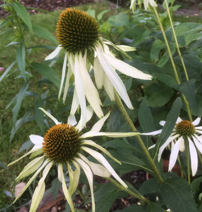 Further round the corner a small border that backs on to the veg plot is shady for the morning but catches the afternoon sun. It seems just enough for the echnicea ‘White Swan’ to get by. This is their second year in the garden and they have bulked up quite well.