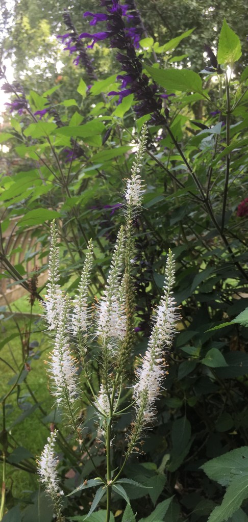 Moving further round, this year’s planting of salvia ‘Amistad’ catches the same afternoon sun and has been magnificent this year. Some of last year’s salvias did over winter, I dug them out of their original position and moved them to a nursery bed when I spotted the new shoots coming through. Those ones have only just really got going and are about half the height. Next to the salvias are three plants of Veronicastrum virginicum ‘Album’. Planted in 2017, they have just made it to a reasonable height this year but clearly they would benefit from less shade. They are just far enough into this border to see a little less of the afternoon sun. I am going to leave them where they are for one more year.