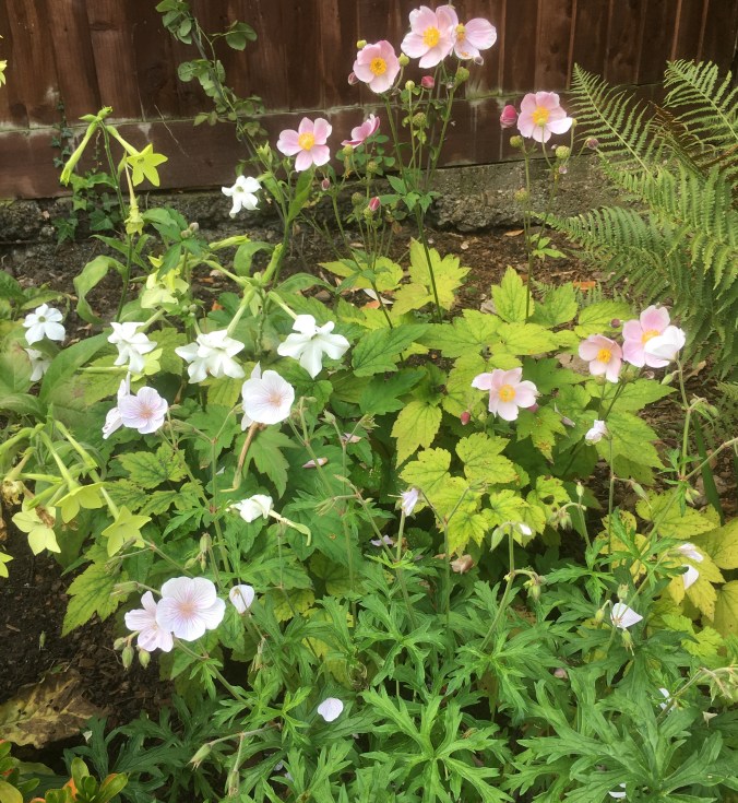 Coming right round the garden, the north facing border begins to take on a western tilt and manages to catch some early morning sun and a good bit of late afternoon sun. The fence line casts shade at the back edge. I am optimistically growing r. Souvenir du Dr Jamain as a climber against the fence – slow going so far. In front, I cleared away the unhealthy choysia and threw in some annuals to cover the ground while I did some thinking. I had a trayful of nicotiana ‘Lime Green’ and n. alata ‘Grandiflora’ to use up so in they went. At the time I did not know that the white variety likes a little shade so I struck lucky with the result. What was a stop gap may now be part of the long term plan. Anemone ‘September Charm’ and a white hardy geranium are also in this mix.