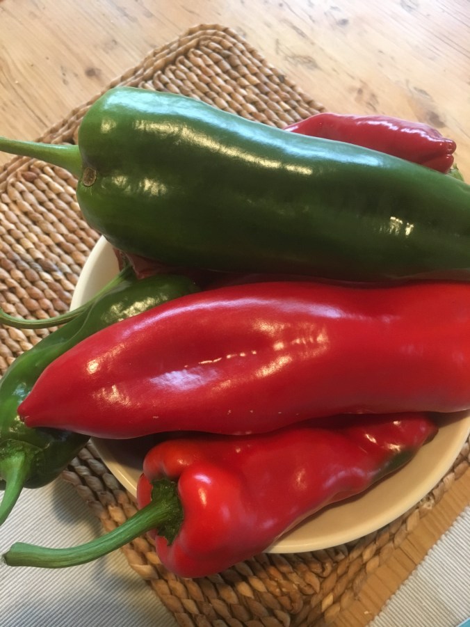 The greenhouse clear out meant bringing in the romano peppers. A few had just about ripened and a week in the kitchen has moved them on a bit more. Time to eat them!