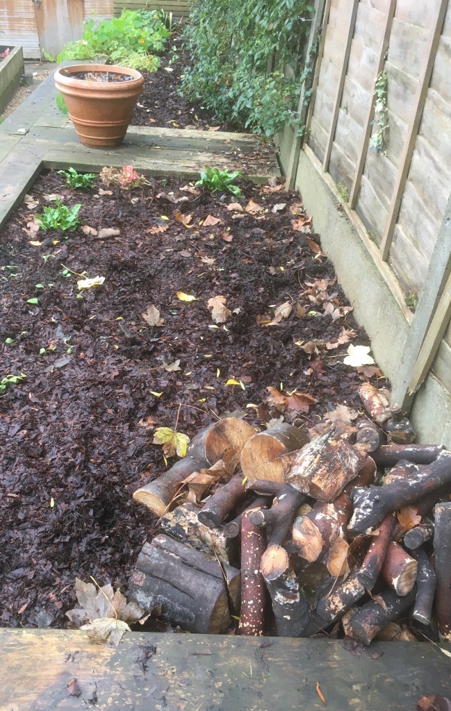 I have some new borders to plant up. This one is at the very back of the garden in the area used for produce. This is a very inhospitable plot for veggies, dry and shady and nothing has fared well here. Now the plan is try some plants. First in were three asplenium scolopendrium or hart’s tongue ferns. In the spring I will add thalictrum, hostas, tiarella and aquilegias. The logs in the corner come from a fig tree, read on for their sad story.