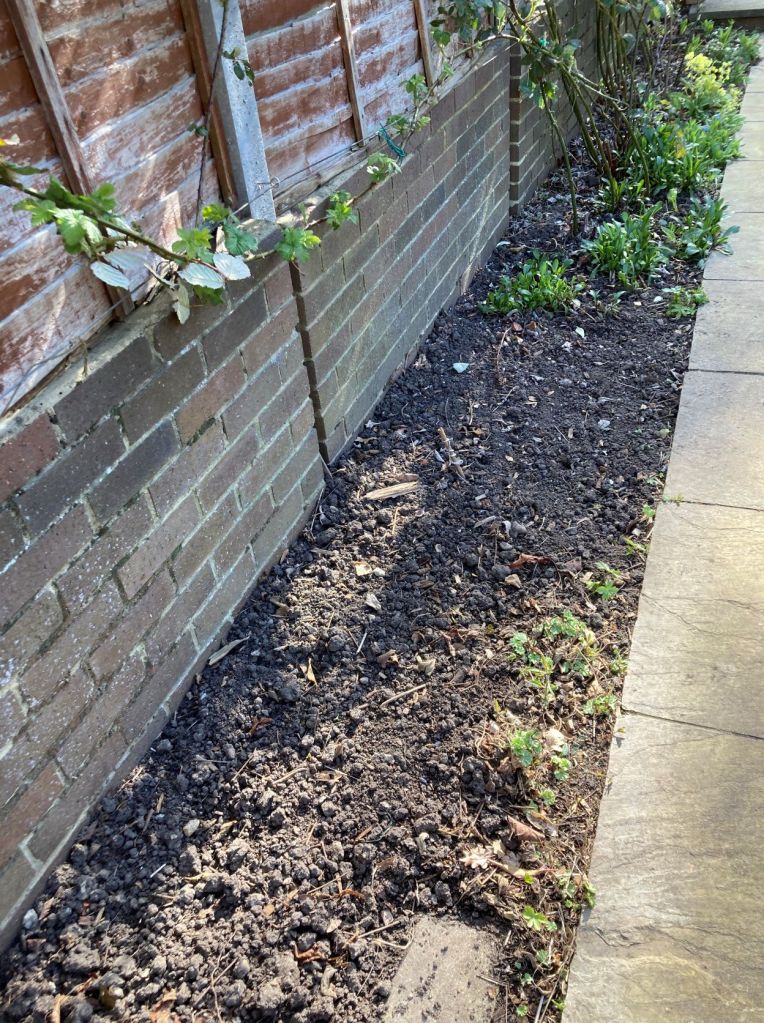 The glorious sunshine of last weekend saw me tackle two gardening jobs on the same day! A good clear out of the potting shed followed by a clear out of this end of the thin border. Previously home to rampant blackberries, generously giving too much fruit to use, a first thinning out was achieved. I know I said I wouldn’t, but I do have a few white dahlias that used to live in pots. They have overwintered and I think for this year at least they will go in here along with some summer annuals while I mull over a permanent plan.