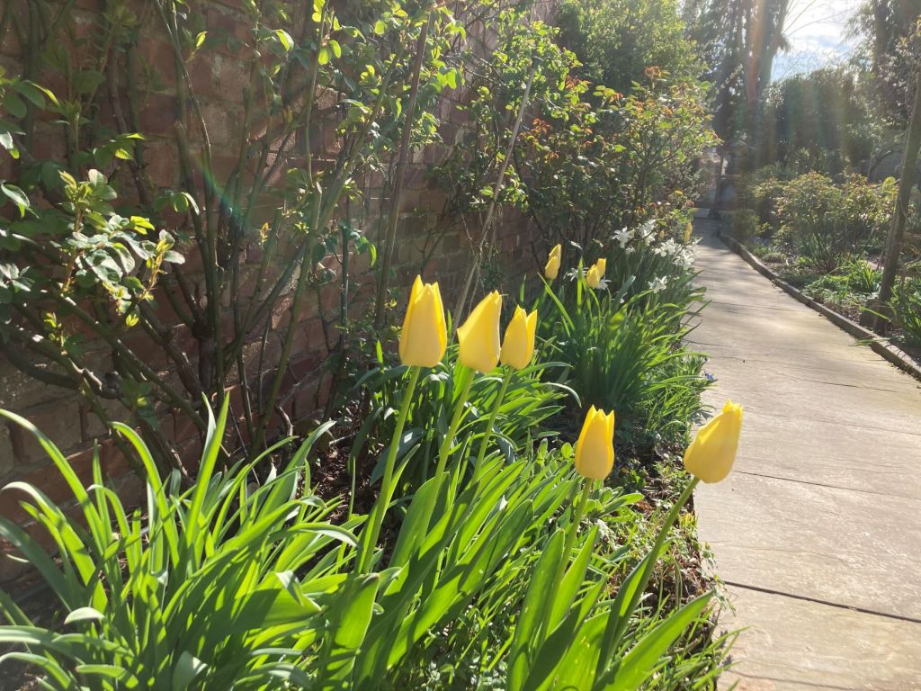 The first tulips to appear in this garden are ‘World Friendship’. They’ve last well over about three years but I think this is the year to top them up. They have a softer yellow colour, not too bright and I think they work well with the thalia.