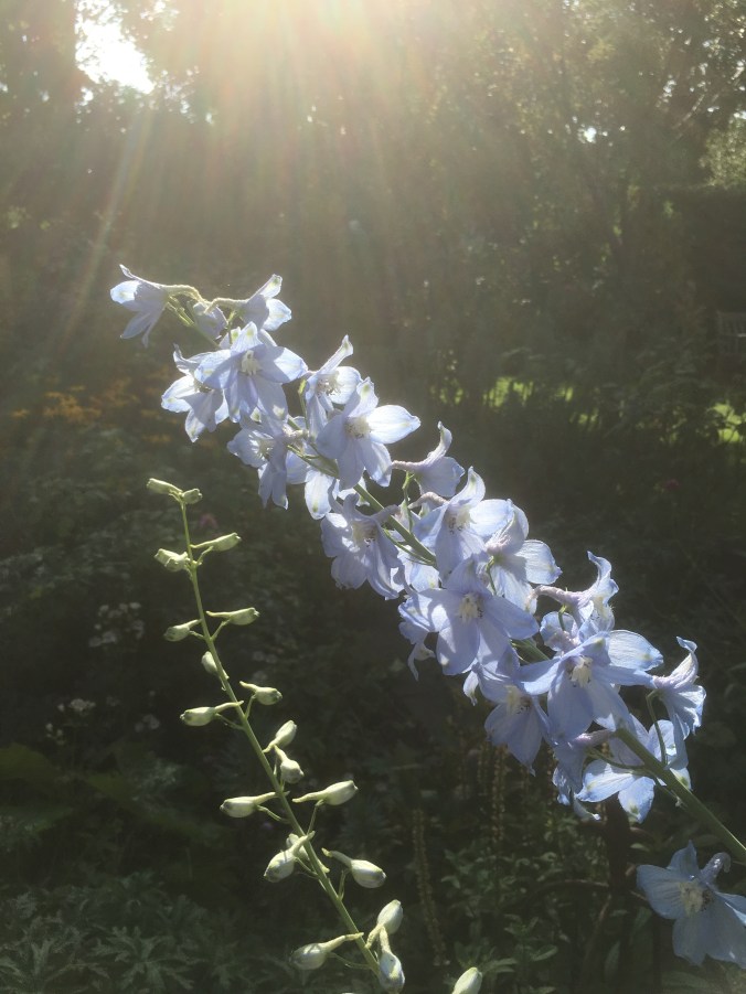 No sooner had the delphiniums put up their second flush of flower stems than the storm arrived. Of course I hadn’t got round to tying in the tops but the ties at the bottom seem to have helped steady the stems enough to keep them safe.