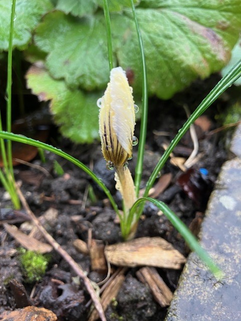 I have a habit of buying a bag of bulbs from market stalls. The bulbs are always named varieties and I fully intend to remember which ones I have planted where. Last year I bought a bag of Jeanne d’Arc crocuses and planted them here. Perhaps I didn’t, perhaps I planted them somewhere else, perhaps they were not Jeanne d’Arc at all. But this is what has grown. Lovely but clearly not Jeanne d’Arc.