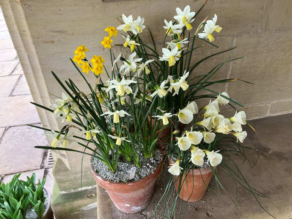 The tête-à-tête daffodils are not quite open yet, one or two are in bud and these later purchases planted in pots have a few more weeks to go. It has been a dry few weeks so these had a watering can full to help them along.