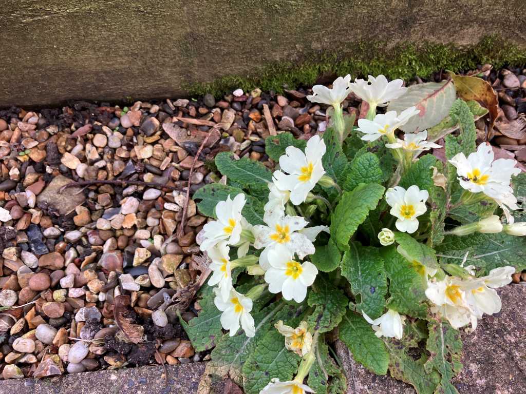 The primroses are having a great time self-seeding around the garden and I am very happy to see them here in a very shallow soil topped with gravel that runs along side a raised bed. I have sprinkled seeds of many an annual here but the primroses arrived under their own steam. The best way!