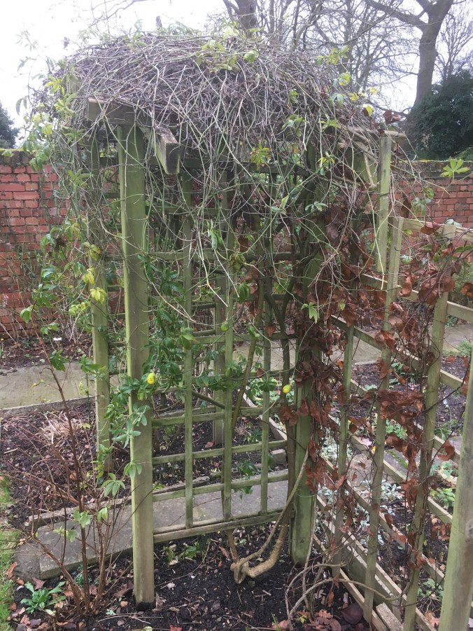The so called warm weather forecast for last week came heavily laden with rain and those days that were dry were cold. But I did have urgent pruning to be done and so I climbed the ladder and pruned the vine. I peered enviously into my neighbours garden, full of greenery from their fabulous selection of shrubs. There was a feeble resolution to plant more shrubs on this side but in reality I prefer the big bang of summer perennials. Back to the vine. It was a joy to prune as I had the right equipment – more later – but there is still plenty of dead wood in there. Another year has passed without the grapes amounting to anything edible but the summers stems provide a shady corner.