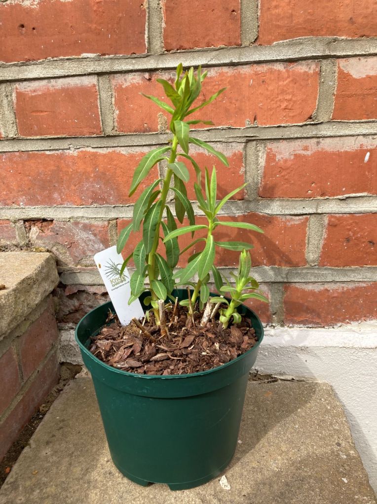 Although the new paving is under review, the gooseberries are definitely going to be replaced by two hydrangea quercifolia ‘ Snow Queen’. There was money off being offered so I couldn’t resist. They are now inhabiting a shady corner until the gooseberries are cleared.