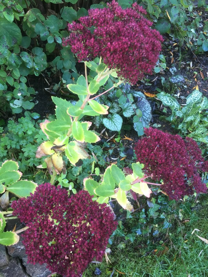 The climbing hydrangea is putting on a golden show over the gloomy fence and the black flower heads are providing an eye catching contrast to the leaves.