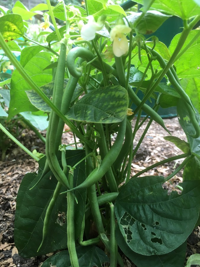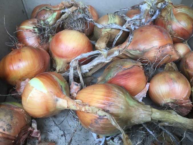I’m also hoping that the red onions will enjoy the showers. I said I wouldn’t grow them again as they are usually so small. These are looking healthy but those bulbs need to grow.