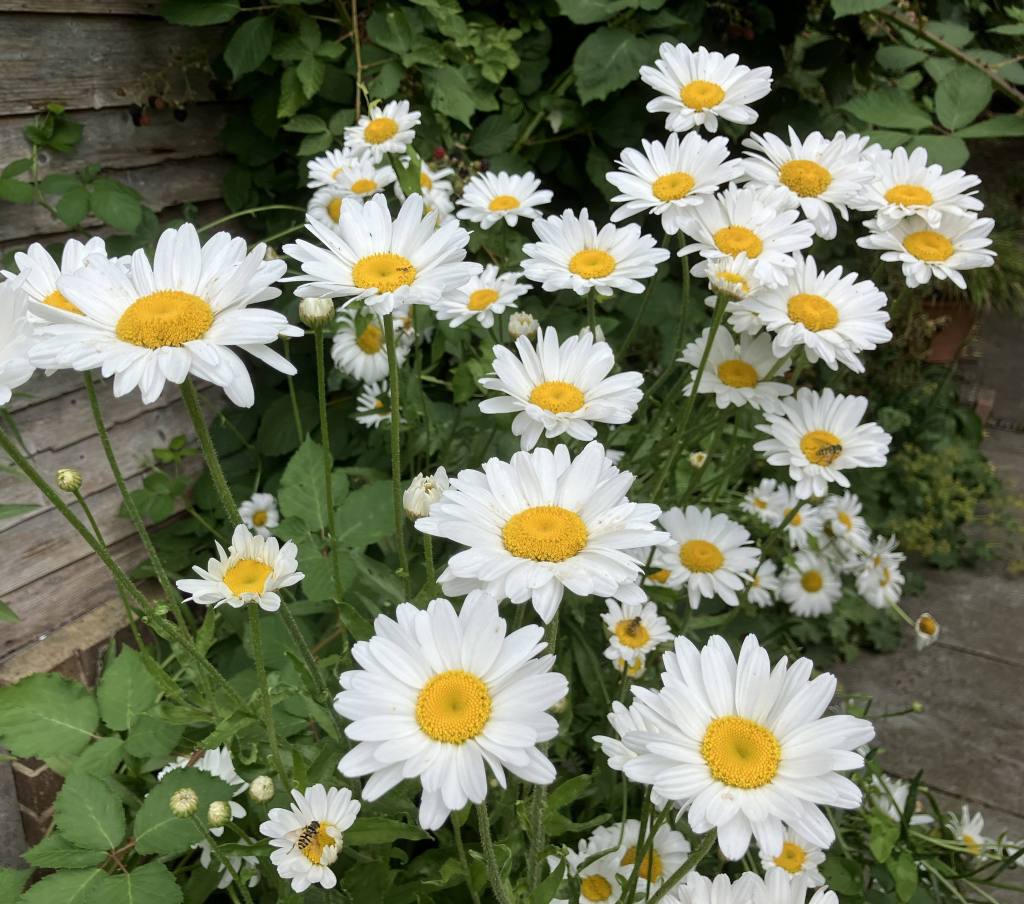On the other hand the leucanthemum superbum are having a riotous time. They have probably grown taller than any year since they were grown from seed some eight years ago. Much loved by hoverflies and apart from the need for vigilant staking they are trouble free.