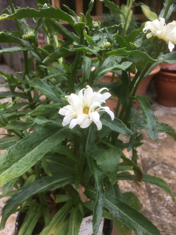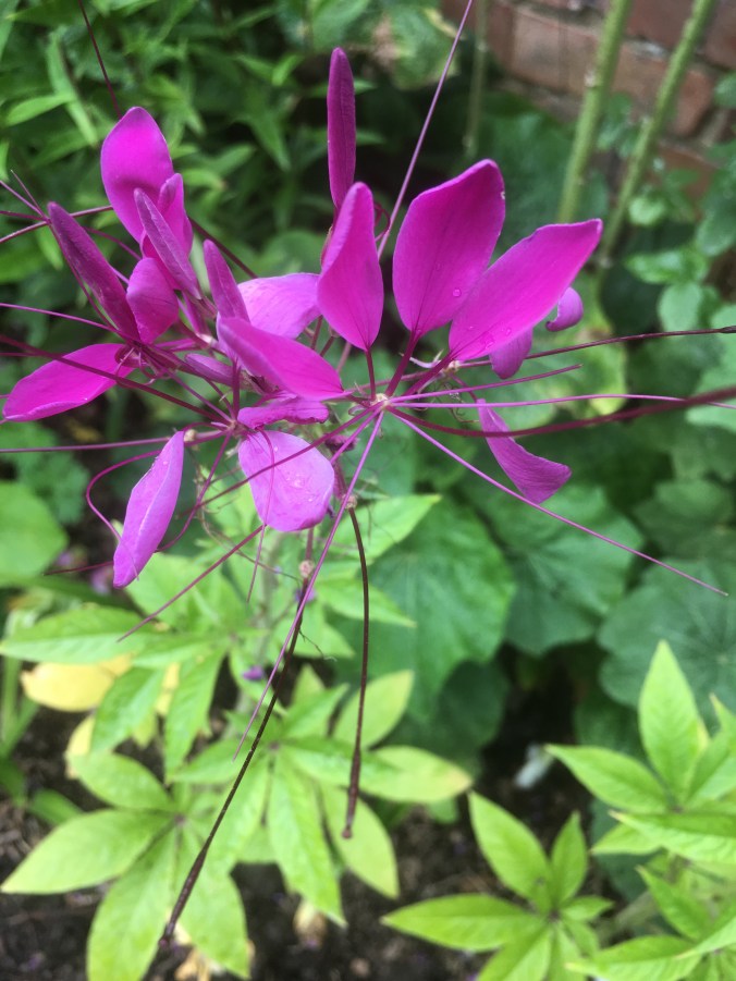Cosmos of course, from this year’s sowing. Last year’s attempts went to the snails and slugs. The dry weather has some advantages.